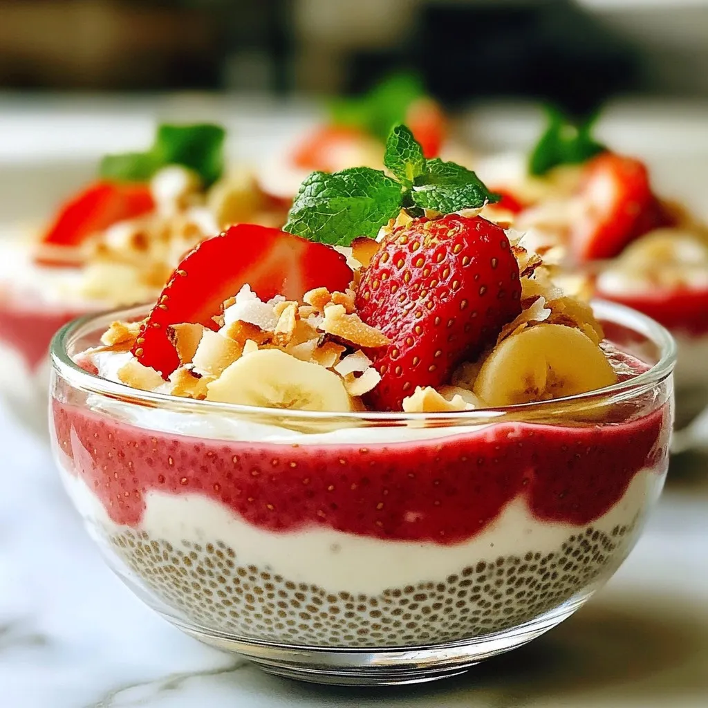 For a sweeter taste, drizzle a little extra maple syrup over the strawberries. Then, sprinkle some toasted coconut flakes on top for crunch. Finally, add a sprig of fresh mint to each serving. This not only enhances flavor but also makes the dish look beautiful. Enjoy your Strawberry Coconut Chia Pudding!