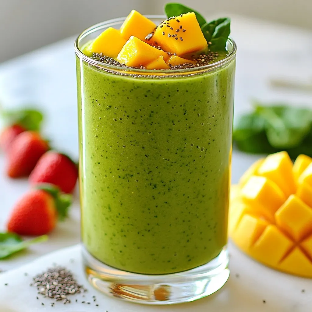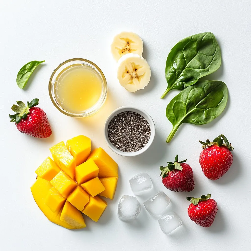 The main ingredients of your Strawberry Mango Spinach Smoothie are fresh and vibrant. You will start with one cup of clean spinach. Spinach is a great leafy green that adds nutrients without strong flavors. Next, grab a ripe mango. It should feel soft when you press it gently. You will want to peel and dice it into small chunks.