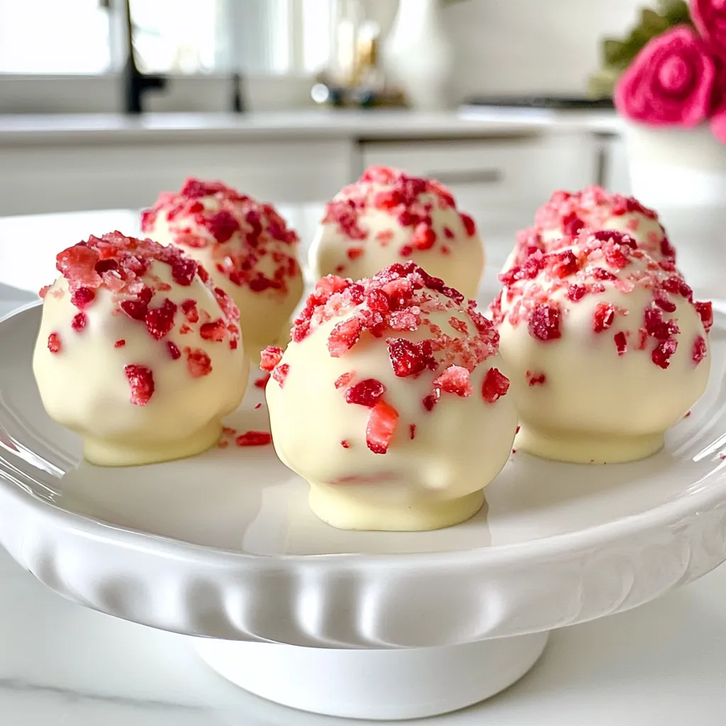 Delicious truffles made with fresh strawberries and vanilla cake, coated in white chocolate and freeze-dried strawberries.