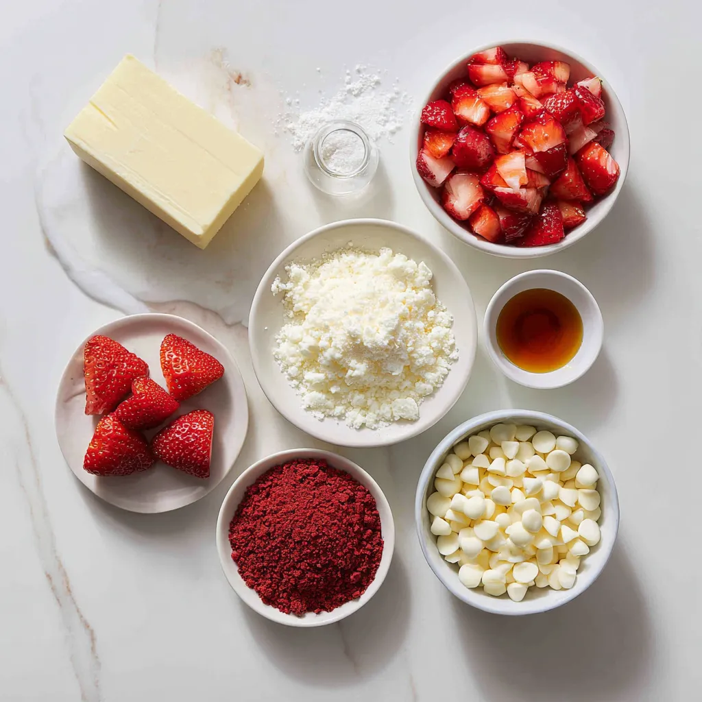 To start, gather all your ingredients. You need fresh strawberries for a fruity taste. The vanilla cake crumbs add a soft texture. Cream cheese binds everything together and gives a nice creaminess. Use powdered sugar to sweeten the mix. A little vanilla extract brings out the flavors.
