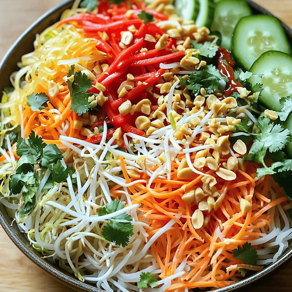 Grab a large salad bowl. Add the shredded carrots, sliced red bell pepper, julienned cucumber, fresh bean sprouts, and chopped cilantro. Make sure to mix these fresh veggies well. Use a gentle tossing technique to avoid crushing them. This way, you keep each veggie crisp and bright.