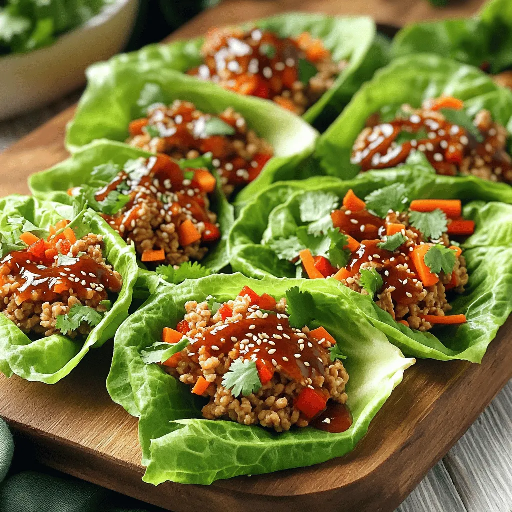 To make Sweet Chili Chicken Lettuce Wraps, you need: - 1 lb (450g) ground chicken - 1 tablespoon vegetable oil - 1 red bell pepper, finely diced - 1 cup carrots, grated - 4 green onions, sliced thinly - 2 cloves garlic, minced - 1 tablespoon fresh ginger, finely grated - 1/4 cup soy sauce - 1/4 cup sweet chili sauce - 1 tablespoon rice vinegar - 1 teaspoon sesame oil - 1 head of butter or iceberg lettuce, leaves carefully separated - Sesame seeds for garnish - Fresh cilantro, roughly chopped, for garnish Using fresh ingredients brings the best flavors. Fresh garlic and ginger add a zing that dried forms can’t match. The crunch of fresh veggies makes each bite exciting. Fresh cilantro adds a bright note that balances the sweet chili sauce. Dried ingredients can work in a pinch, but they won’t deliver the same taste. If you don’t have ground chicken, try ground turkey. It works well in this recipe. For a vegetarian option, use crumbled tofu or tempeh. If you want a spicy kick, add some red pepper flakes to the sauce. Don’t have sesame oil? Use olive oil instead. You can swap soy sauce with tamari for a gluten-free option. Each substitution still keeps the dish tasty and fun. First, gather all your ingredients. You need ground chicken, vegetable oil, red bell pepper, carrots, green onions, garlic, ginger, soy sauce, sweet chili sauce, rice vinegar, sesame oil, and lettuce. 1. Heat the vegetable oil in a large skillet over medium heat. 2. Add minced garlic and grated ginger. Sauté for about 1 minute. 3. Next, add the ground chicken. Break it apart as it cooks. 4. Cook until the chicken is browned, about 5-7 minutes. 5. Stir in red bell pepper, grated carrots, and green onions. Cook for 3-4 minutes. 6. In a small bowl, whisk together soy sauce, sweet chili sauce, rice vinegar, and sesame oil. 7. Pour the sauce over the chicken mixture. Stir well and cook for another 2-3 minutes. 8. Remove the skillet from heat. Let the mixture cool a bit before serving. Take a lettuce leaf and add a generous spoonful of the chicken mixture. Top with sesame seeds and fresh cilantro. For a bright display, arrange the wraps on a colorful platter. Drizzle any leftover sauce from the skillet over the wraps for extra flavor. To boost the taste of your Sweet Chili Chicken Lettuce Wraps, use fresh ingredients. Fresh ginger and garlic bring a stronger taste than dried ones. Adjust the sweet chili sauce to suit your taste. If you like it sweet, add more sauce. For a spicy kick, mix in some red pepper flakes. Start with a hot skillet to brown the chicken well. This step adds a nice depth of flavor. Stir often to ensure even cooking. When adding vegetables, don’t overcook them. You want them tender but still crisp. This keeps the wraps bright and fresh. Make your wraps look great by using a colorful platter. Arrange the filled lettuce leaves neatly. Drizzle extra sauce over the wraps for a shiny finish. Sprinkle sesame seeds and cilantro on top for a pop of color. This makes the dish inviting and fun to eat. {{image_4}} You can easily make sweet chili chicken lettuce wraps gluten-free. Just swap soy sauce for tamari. This small change keeps your meal safe for those with gluten issues. For a low-carb version, use more veggies and less sauce. You can also cut out the rice vinegar if you want to lower carbs even further. Ground chicken is great, but you can use other proteins. Ground turkey works just as well and has a similar taste. If you prefer a plant-based option, try crumbled tofu. Tofu absorbs flavors well and gives a nice texture. You can also use ground pork or even shrimp for a seafood twist. The sweet chili sauce adds a nice kick. However, you can mix it up! Try adding sriracha for heat or hoisin sauce for a sweet twist. If you want a smoky flavor, add a touch of smoked paprika. Experiment with fresh herbs like basil or mint for unique tastes. Each change can give your lettuce wraps a new life! After making Sweet Chili Chicken Lettuce Wraps, let them cool to room temperature. Place any leftover chicken mixture in an airtight container. Store it in the fridge for up to 3 days. The lettuce leaves should stay separate. Wrap them in a damp paper towel to keep them crisp. You can freeze the chicken mixture for later use. Place it in a freezer-safe container. It will last for up to 3 months. When ready to eat, thaw it overnight in the fridge. Do not freeze the lettuce leaves, as they will become soggy. To reheat the chicken mixture, use a skillet over medium heat. Stir often until it is hot. You can also use a microwave. Heat in short bursts, stirring in between, until warm. Serve in fresh lettuce leaves for a crunchy wrap. Yes, you can use other types of lettuce. Romaine or butter lettuce works well. Each type gives a different crunch and taste. You can also try cabbage leaves for a firmer wrap. To add heat, use more sweet chili sauce or add red pepper flakes. You can also mix in chopped fresh chili peppers. For a zesty kick, try a dash of hot sauce. Adjust the spice level to your taste. Serve these wraps with rice or noodles for a complete meal. A side salad adds freshness too. You can also offer extra sauce for dipping. Fresh fruit or spring rolls make great sides as well. This blog post covered key ingredients for your dish, including fresh versus dried options and substitutions. You learned step-by-step instructions for prep, cooking, and serving. We explored tips for better flavor, techniques, and presentation. I shared ways to adapt the recipe for different diets and proteins, along with storage and reheating tips. Remember, cooking is fun and flexible. Feel free to experiment and make it your own!