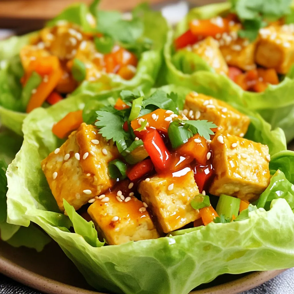 - 1 block firm tofu, drained and pressed - 2 tablespoons cornstarch - 2 tablespoons vegetable oil Tofu is the star of this dish. I always use firm tofu for its great texture. First, press the tofu to remove excess water. This step helps the tofu become crispy when cooked. Cut the tofu into small cubes to ensure even cooking. Coat the tofu cubes with cornstarch for a crunchy finish. - 1 red bell pepper, finely diced - 1 medium carrot, grated - 3 green onions, sliced (whites and greens separated) Fresh veggies make this dish pop! I love using red bell pepper for its sweetness and color. Grated carrot adds a nice crunch, while green onions give a burst of flavor. Remember to separate the white and green parts of the onions. This adds depth to your meal. - 2 tablespoons sweet chili sauce - 1 tablespoon soy sauce - 1 teaspoon sesame oil The sauce ties everything together. Sweet chili sauce brings a delightful sweetness, while soy sauce adds umami. A little sesame oil gives a rich, nutty flavor. Mix these ingredients well to ensure every bite is packed with taste. To start, cut the pressed tofu into small cubes, about 1 inch wide. This size helps the tofu cook evenly. Use a paper towel to pat the cubes dry. This step is key. It removes moisture, which helps the tofu become crispy when cooked. Next, heat vegetable oil in a large skillet over medium-high heat. Wait until the oil shimmers, then add the tofu cubes. Cook for about 5-7 minutes. Turn the cubes often for even browning. You want them crispy and golden on all sides. Once the tofu is ready, add the diced red bell pepper, grated carrot, and the white parts of the green onions to the skillet. Sauté these for about 3-4 minutes. Stir them occasionally. You want the veggies tender but still crisp. In a small bowl, mix the sweet chili sauce, soy sauce, and sesame oil. Pour this sauce over the tofu and veggies. Stir gently to coat everything. Cook for another 1-2 minutes until it is all heated through. Remove the skillet from heat. Let the mixture cool for a few minutes. Then, take a leaf of butter lettuce. Place it on your plate. Spoon a generous amount of the tofu mix into the center of the leaf. Let some overflow for a fun look. To finish, add the green tops of the sliced green onions on top. Sprinkle fresh cilantro leaves over the cups. If you like, add sesame seeds for a nice touch. These garnishes make your dish pop with color and flavor! To make crispy tofu, start by pressing it well. Remove as much water as you can. Cut the tofu into small, even cubes. This helps them cook evenly. Pat the cubes dry with a paper towel. Next, coat the tofu in cornstarch. This creates a nice crunch when cooked. Heat vegetable oil in a skillet until it's hot. Carefully add the tofu and let it cook undisturbed for a few minutes. This way, it browns nicely on all sides. Turn the tofu gently to avoid breaking it. Cook until golden and crispy. For lettuce cups, I recommend butter lettuce or iceberg lettuce. Butter lettuce is soft and pliable, making it easy to fold. Iceberg has a nice crunch and keeps its shape well. Both types add great texture to your dish. When choosing lettuce, look for fresh, green leaves. Avoid any that are wilted or brown. Wash the leaves gently and pat them dry before use. This ensures they are clean and crisp when you serve. To serve your sweet chili tofu lettuce cups, arrange them on a big platter. It looks colorful and inviting. You can add extra sweet chili sauce in a small bowl for dipping. This gives everyone a chance to add more flavor if they want. For a fun twist, add some fresh herbs like cilantro on top. You can also sprinkle sesame seeds for a bit of crunch. These small touches make your dish even more appealing. Enjoy your tasty creation with friends or family! {{image_4}} You can swap tofu for other proteins. Tempeh is a great choice. It has a nutty flavor and is high in protein. You can also use cooked chicken for a meatier option. Just cut it into small pieces. Cook it until golden before adding the vegetables. This gives a nice texture. Feel free to change the veggies. You can add shredded cabbage for crunch. Mushrooms can add a nice umami flavor. Swap red bell pepper for zucchini or snap peas for a twist. Carrots can be replaced with radishes for a peppery kick. Be creative and use what you love! The sauce is key to flavor. You can adjust it based on your taste. Add lime juice for a zesty kick. Try hoisin sauce for a sweeter, richer taste. If you like it spicy, add some chili flakes or sriracha. Mix and match sauces to find your perfect blend! To store leftovers, place the tofu and vegetable mix in an airtight container. Make sure to separate the filling from the lettuce leaves. Store everything in the fridge for up to three days. This keeps the lettuce fresh and crisp. When ready to eat, gently reheat the tofu mixture. Use a skillet over low heat. Stir occasionally until warmed through. Avoid microwaving, as it can make the tofu soggy. Enjoy the freshness and flavor as if it were just made! You can freeze the tofu filling, but not the lettuce. Place the cooled mixture in a freezer-safe bag. Remove as much air as possible before sealing. It will last for up to two months. When ready to eat, thaw overnight in the fridge and reheat as described above. Yes, you can use frozen tofu. Freezing tofu changes its texture, making it spongy. This helps it soak up sauces better. Just remember to thaw it first. Drain the water and press it well before cooking. You can use a mix of honey and Sriracha as a substitute. This blend gives a sweet and spicy flavor. Alternatively, mix soy sauce with a little sugar for a milder taste. Adjust the amounts to match your taste. To make this dish vegan, simply replace the honey with maple syrup. Ensure the soy sauce is vegan-friendly. Most brands are, but it’s good to check. This keeps the flavors while meeting vegan needs. Yes, you can prepare the filling in advance. Cook the tofu and vegeta