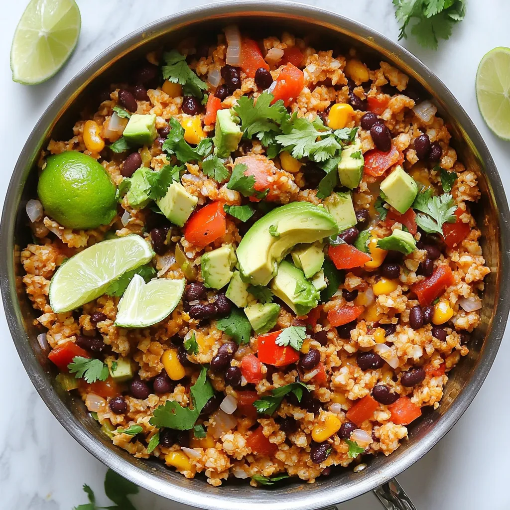 A flavorful and healthy skillet dish featuring riced cauliflower, black beans, and vibrant vegetables, seasoned with taco spices.