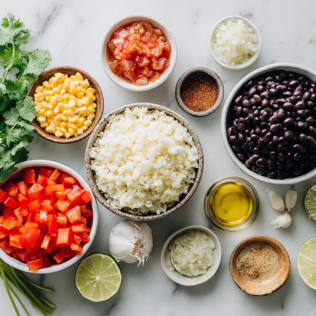 The main star here is cauliflower. Riced cauliflower gives this dish a light base. It cooks quickly and absorbs flavors well. Black beans add protein and fiber. They also bring a nice texture. Diced tomatoes bring moisture and a bit of acidity. This helps balance the flavors. Corn kernels add sweetness. They complement the savory notes from the beans and tomatoes.