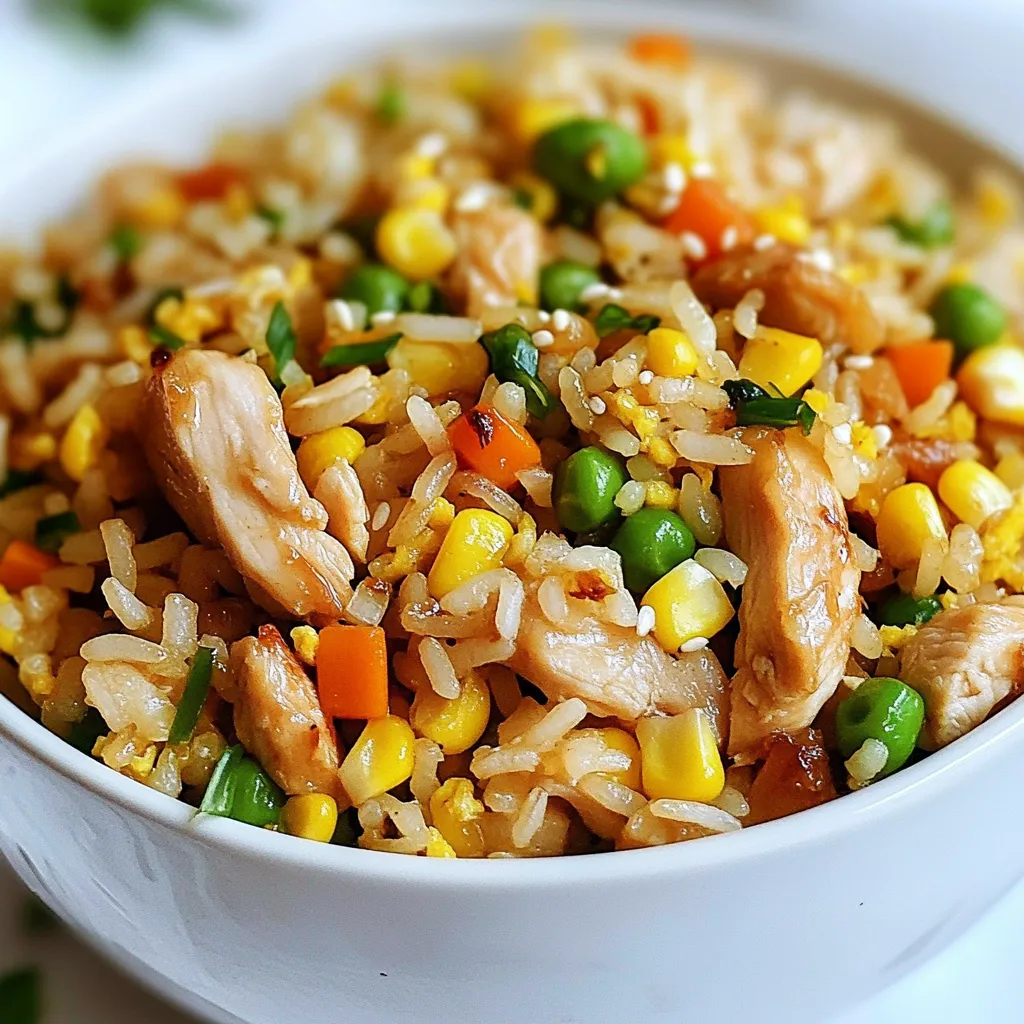 Using day-old rice is key. It has less moisture, which helps avoid mushy fried rice. Cooked chicken breast adds protein, while the teriyaki sauce brings a sweet and savory flavor. Mixed vegetables give color and nutrients, making each bite bright and healthy. Green onions add a fresh crunch, while eggs help bind the dish together.