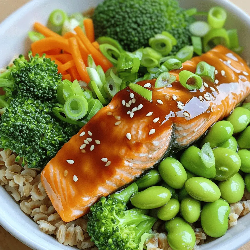 To make teriyaki salmon bowls, you'll need these key ingredients: - 2 fresh salmon fillets - 1 cup brown rice - 1/4 cup low-sodium soy sauce - 2 tablespoons honey or maple syrup - 1 tablespoon rice vinegar - 1 tablespoon sesame oil - 1 teaspoon fresh ginger, minced - 1 teaspoon garlic, minced - 1 cup broccoli florets - 1 carrot, julienned - 1/2 cup shelled edamame - 2 green onions, finely sliced - Sesame seeds for garnish - Salt and pepper to taste These ingredients come together to create a flavorful and healthy meal. You can enhance your teriyaki salmon bowls with these optional ingredients: - Lime wedges for a zesty kick - Avocado slices for creaminess - Red pepper flakes for heat - Peanuts for extra crunch Adding these options can make your dish even more exciting and tailored to your taste. Let’s break down the nutrition of some main ingredients: - Salmon: Rich in omega-3 fatty acids, which support heart health. - Brown Rice: High in fiber, offering sustained energy and aiding digestion. - Broccoli: Packed with vitamins C and K, great for immune support. - Edamame: A good source of protein and healthy fats. These ingredients not only taste great but also provide a balanced mix of nutrients. Enjoying this meal gives you comfort and nourishment. To make the marinade, grab a small bowl. Whisk together 1/4 cup of low-sodium soy sauce, 2 tablespoons of honey or maple syrup, 1 tablespoon of rice vinegar, and 1 tablespoon of sesame oil. Add 1 teaspoon of minced ginger and 1 teaspoon of minced garlic. Mix it all well. This rich blend will give your salmon that sweet and savory teriyaki flavor. Now, take your 2 fresh salmon fillets and place them in a shallow dish. Make sure they have space around them. Pour half of your marinade over the salmon. Turn the fillets gently to coat them well. Cover the dish and let the salmon marinate for at least 20 minutes. This time allows the fish to soak up the yummy flavors. While the salmon marinates, rinse 1 cup of brown rice under cold water. This will help remove the extra starch. In a medium pot, combine the rinsed rice with 2 cups of water and a pinch of salt. Bring the pot to a boil. Then, lower the heat, cover it, and let it simmer for about 40-45 minutes. Once the rice is done, fluff it with a fork to separate the grains. While the rice cooks, it’s time to prepare your veggies. Take 1 cup of broccoli florets and 1 julienned carrot. You can steam them in a steamer basket or microwave them with a bit of water. Steam for about 5-7 minutes until they are tender but still crisp. This will keep their bright colors and nutrients. Next, heat a non-stick skillet over medium-high heat. Carefully take the salmon out of the marinade. Let any extra marinade drip off. Place the fillets skin-side down in the hot skillet. Cook them for about 4-5 minutes. Then, flip the fillets and brush them with the rest of the marinade. Cook for another 3-4 minutes until the salmon is fully cooked and flakes easily. Now comes the fun part—putting it all together! Start with a generous serving of brown rice as the base in each bowl. On top of the rice, place pieces of the cooked salmon. Next, add the steamed broccoli, carrots, and shelled edamame. For a final touch, sprinkle sliced green onions and sesame seeds on top. This adds a nice crunch and makes your dish look amazing. To get the best flavor, marinate your salmon well. Use a shallow dish to help the marinade cover the fish fully. Pour half of the teriyaki mix over the fillets. Turn them gently to coat. Let them marinate for at least 20 minutes. For a stronger taste, marinate for up to one hour. This helps the flavors soak in. Always keep salmon in the fridge while it marinates. Cooking brown rice is simple but needs attention. Start by rinsing the rice under cold water. This removes extra starch and helps it cook better. Use a pot with a lid. For one cup of rice, add two cups of water and a pinch of salt. Bring it to a boil, then reduce the heat. Cover and let it simmer for 40-45 minutes. When done, fluff the rice with a fork to separate the grains. For the best texture, steam your vegetables. Steaming keeps them bright and crisp. Use a steamer basket or a microwave. Steam broccoli and carrots for about 5-7 minutes. They should be tender but still have a little crunch. This way, they add a nice bite to your bowl. Make your bowl look great! Start with a layer of fluffy brown rice. Place the salmon on top, then add your steamed veggies. A sprinkle of green onions adds color. Finish with sesame seeds for crunch. You can drizzle more teriyaki sauce on top for extra flavor. Serve with a lime wedge for a fresh kick. {{image_4}} If you want to switch things up, try different proteins. Chicken is a great choice. Use boneless thighs or breasts. They soak up the teriyaki sauce well. Tofu is another option. Firm tofu can absorb flavors and grill nicely. Shrimp is also tasty. Just cook them until they turn pink and opaque. Brown rice is classic, but many grains work here. Quinoa offers a nutty taste and cooks quickly. It is high in protein too. Farro adds a chewy texture and is very filling. You could also use white rice if you prefer a softer bite. Cauliflower rice is a low-carb choice and adds a nice lightness. To make this dish vegan, swap the salmon for tofu or tempeh. Marinate it just like the salmon for great flavor. Use maple syrup instead of honey for sweetness. For a boost in protein, add chickpeas or lentils. You can still enjoy all the veggies like broccoli and carrots for crunch and color. To keep your teriyaki salmon bowls fresh, store leftovers in airtight containers. Make sure to separate the salmon, rice, and veggies to keep the textures intact. They will stay good in the fridge for up to three days. If you want to keep them longer, you can freeze them. Just be aware that freezing may change the texture of the salmon slightly. When it's time to eat your leftovers, reheat them gently. You can use the microwave, b
