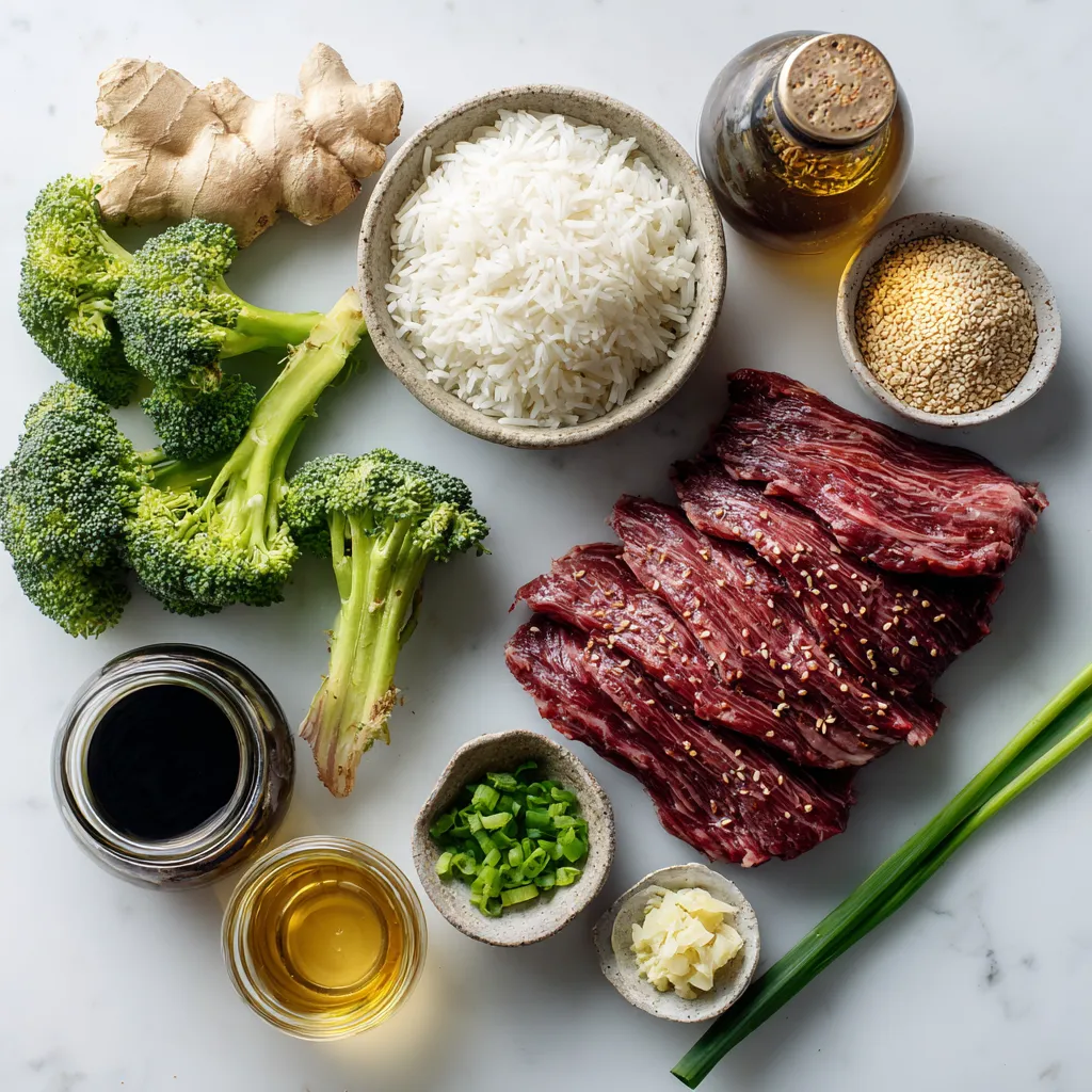 The key ingredients create a tasty teriyaki steak and broccoli bowl. Freshness matters. Fresh broccoli and ginger boost flavor. Choose good quality flank steak for the best taste and texture.