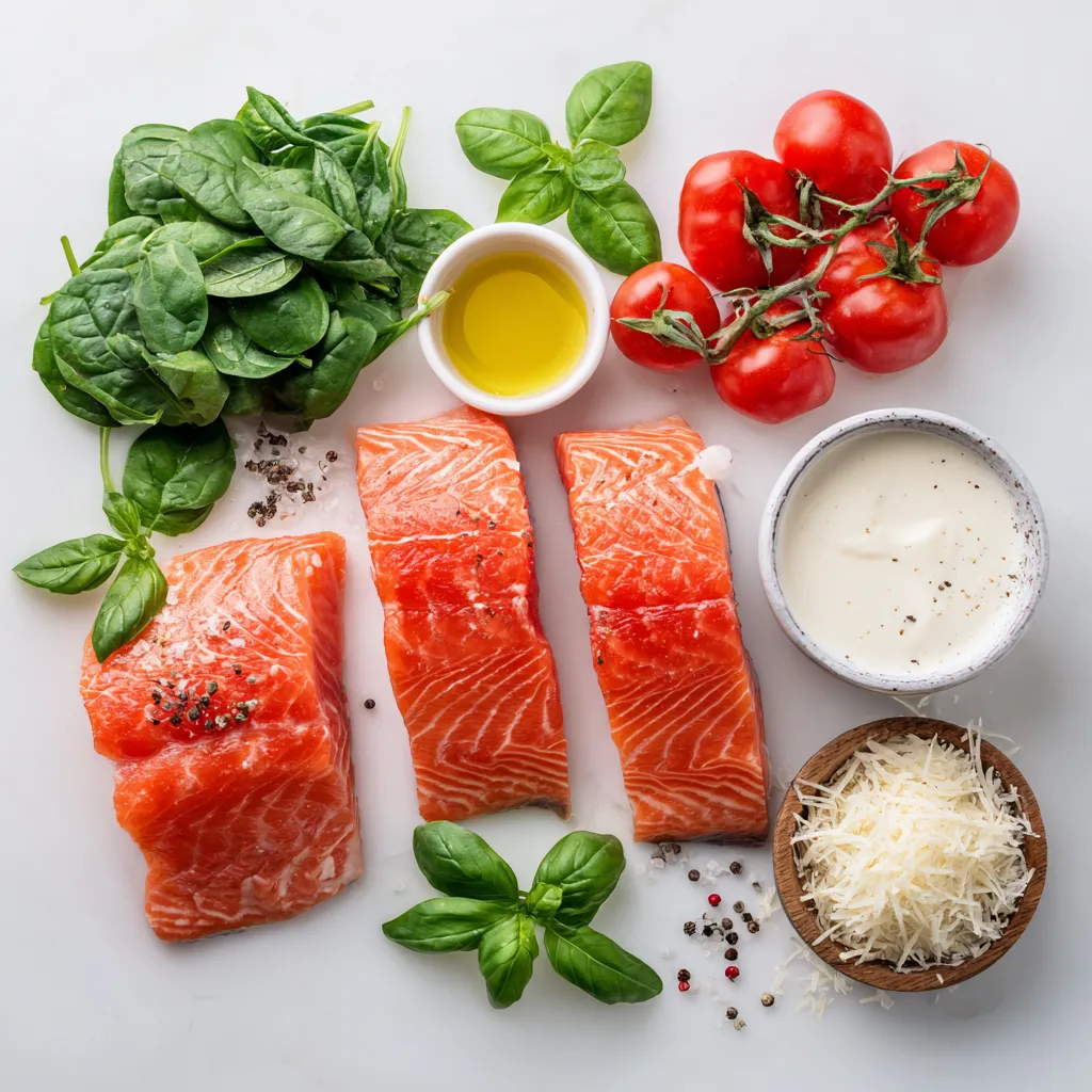 The key to making Tuscan salmon in cream sauce is choosing fresh, quality ingredients. Salmon fillets serve as the star of the dish. I prefer wild-caught salmon for its rich flavor and firm texture. The olive oil provides the perfect base for cooking. Garlic adds depth, while cherry tomatoes bring a burst of sweetness. Fresh spinach not only adds color but also boosts nutrition.