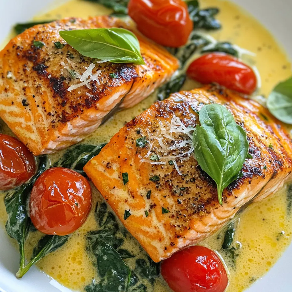 A delicious and creamy salmon dish infused with garlic, tomatoes, and spinach, perfect for a quick weeknight dinner.