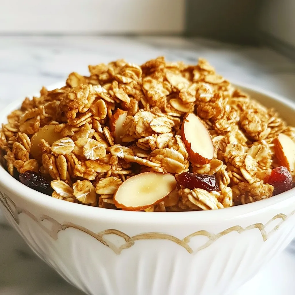 To make delicious vanilla almond granola, gather these key ingredients: - 2 cups rolled oats - 1 cup almonds, roughly chopped - 1/2 cup honey or maple syrup (your choice) - 1/4 cup coconut oil, melted - 1 teaspoon pure vanilla extract - 1/2 teaspoon sea salt - 1 teaspoon ground cinnamon - 1/2 cup dried cranberries or raisins (optional) - 1/4 cup pumpkin seeds (optional) Each ingredient plays a role. The oats form the base, while the almonds add crunch. Honey or maple syrup gives sweetness and stickiness. Coconut oil binds everything and adds a light flavor. Vanilla extract enhances the taste. Sea salt and cinnamon balance the flavors, making it all pop. The optional ingredients can add extra texture and taste. You can add dried cranberries or raisins for sweetness and chewiness. They also provide vitamins and antioxidants. Pumpkin seeds offer a nutty flavor and are rich in protein and minerals. Including these can make your granola more nutritious and interesting. If you need to swap an ingredient, here are some ideas: - Use agave syrup instead of honey or maple syrup for a vegan option. - Substitute sunflower seeds for almonds if you're allergic to nuts. - Swap coconut oil for olive oil or butter, but keep in mind the flavor change. These substitutions allow you to customize the granola while still keeping it tasty. {{ingredient_image_2}} First, preheat your oven to 325°F (160°C). This step helps your granola bake evenly. Line a large baking sheet with parchment paper. This keeps your granola from sticking. In a big mixing bowl, add the rolled oats, chopped almonds, sea salt, and ground cinnamon. Stir these dry ingredients well. This ensures a nice mix of flavors. Next, in a separate bowl, whisk together the melted coconut oil, honey (or maple syrup), and pure vanilla extract. Mix until smooth. This mixture adds sweetness and flavor. Pour this wet mix over the dry ingredients. Use a spatula to blend it all together. Make sure every oat and almond is coated. This helps the granola stick together. Spread the granola evenly on the prepared baking sheet. Make sure it is in a single layer. This helps it cook well. Bake in your preheated oven for 15 to 20 minutes. Stir it halfway through baking. This helps it brown evenly. Keep an eye on it as it bakes. You want it golden brown, not burnt. Once it's done baking, take it out of the oven. Let it cool completely on the baking sheet. Cooling helps it get crunchy. After it cools, you can fold in the dried cranberries and pumpkin seeds if you want. This adds extra flavor and texture. Store your granola in an airtight container. It will stay fresh at room temperature for up to two weeks. Enjoy your homemade vanilla almond granola! To get that perfect crunch in your granola, follow these steps: - Use enough fat: The melted coconut oil helps bind the ingredients and adds crunch. - Spread evenly: Make sure to spread the granola in a thin layer on the baking sheet. - Bake low and slow: Bake at 325°F (160°C) to prevent burning while still getting crispy. - Stir halfway: Mixing it halfway through ensures even browning and prevents soft spots. - Cool completely: Letting the granola cool on the sheet helps it firm up. Avoid these common mistakes to ensure your granola turns out great: - Too much moisture: Using too much honey or syrup can make it soggy. - Skipping the salt: A pinch of sea salt enhances flavors and balances sweetness. - Not monitoring baking time: Keep an eye on it! Baking too long can lead to burnt granola. - Packing too tightly: If you pack it down too much, it won't crisp up properly. You can boost the flavor of your granola with a few simple tweaks: - Add spices: Try nutmeg or ginger for a warm, cozy flavor. - Mix in extracts: Experiment with almond or maple extracts for a unique twist. - Use different nuts: Walnuts or pecans can add different textures and flavors. - Incorporate fruits: Dried fruits like apricots or figs can add sweetness and chew. - Finish with chocolate: Add dark chocolate chunks after baking for a sweet surprise. Pro Tips Use Fresh Ingredients: Always opt for fresh, high-quality nuts and seeds to enhance the flavor and nutritional value of your granola. Adjust Sweetness: Feel free to adjust the amount of honey or maple syrup based on your personal taste preferences or dietary needs. Experiment with Add-ins: Customize your granola by adding other dried fruits, seeds, or spices to create your perfect blend. Store Properly: To maintain freshness and crunch, store granola in an airtight container in a cool, dry place. {{image_4}} You can change the taste of your granola by adding new flavors. Try using nuts like walnuts or pecans instead of almonds. You can also swap out honey for agave syrup for a different sweetness. For a chocolate twist, mix in cocoa powder or chocolate chips. If you want a fruity flavor, add dried mango or apricots. These changes keep things fun and exciting! If you need a gluten-free granola, use certified gluten-free oats. For nut-free options, replace almonds with pumpkin seeds or sunflower seeds. You can still enjoy the crunchy texture and taste with these swaps. Just make sure to read labels on your ingredients to avoid hidden gluten or nuts. Seasonal add-ins can make your granola special. In spring and summer, add fresh berries like strawberries or blueberries. In fall, mix in chopped apples or pumpkin puree for a cozy flavor. During winter, dried fruits like figs or dates add warmth. These additions not only taste great but also give your granola a lovely seasonal flair. To keep your Vanilla Almond Granola fresh, use an airtight container. Glass jars or plastic containers work well. Make sure the container seals tightly. Store it in a cool, dry place away from direct sunlight. This helps maintain its crunch and flavor. For longer freshness, you can add a piece of bread in the container. This helps absorb moisture. Just replace the bread slice every few days. Also, avoid using wet hands whe