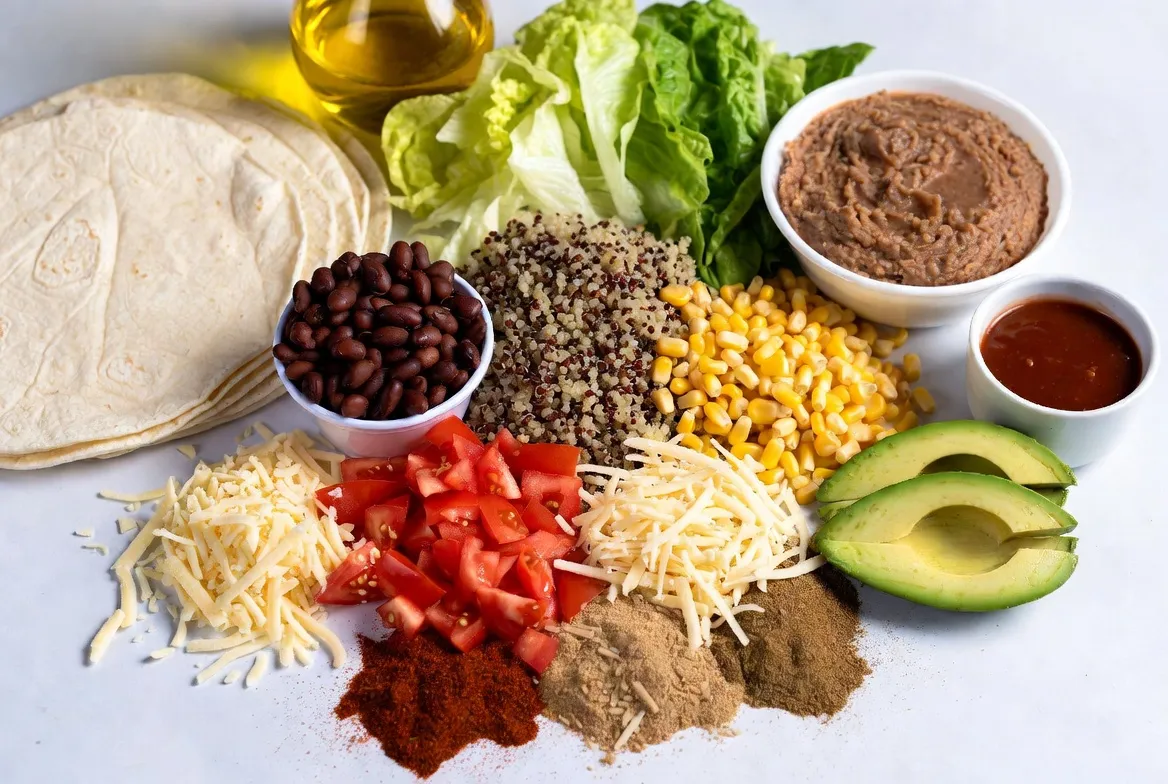 โ€“ Assembling the crunchwrap: Take a flour tortilla and place it flat on your surface. Spread a layer of warm refried beans in the center. Next, add the quinoa-corn mixture on top. Sprinkle vegan cheese, add avocado slices, and a bit of taco sauce. Finish with shredded lettuce and diced tomatoes.