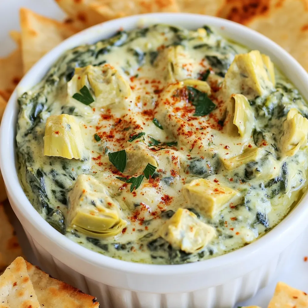 Serve this dip warm with a variety of dippers. Crisp pita chips, crunchy vegetable sticks, or toasted bread slices work great. For a fun twist, offer sliced bell peppers or cucumber rounds. Garnish with paprika or chopped herbs for a pop of color. Not only does this enhance the look, but it also adds extra flavor. Enjoy your creamy vegan spinach artichoke dip with friends or family!