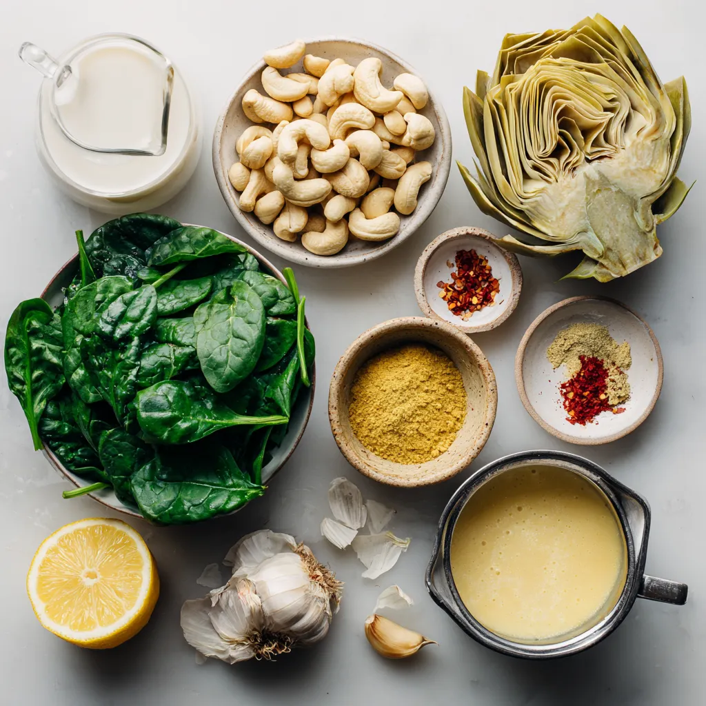 A delicious and creamy vegan dip made with spinach, artichoke hearts, and cashews, perfect for parties or gatherings.