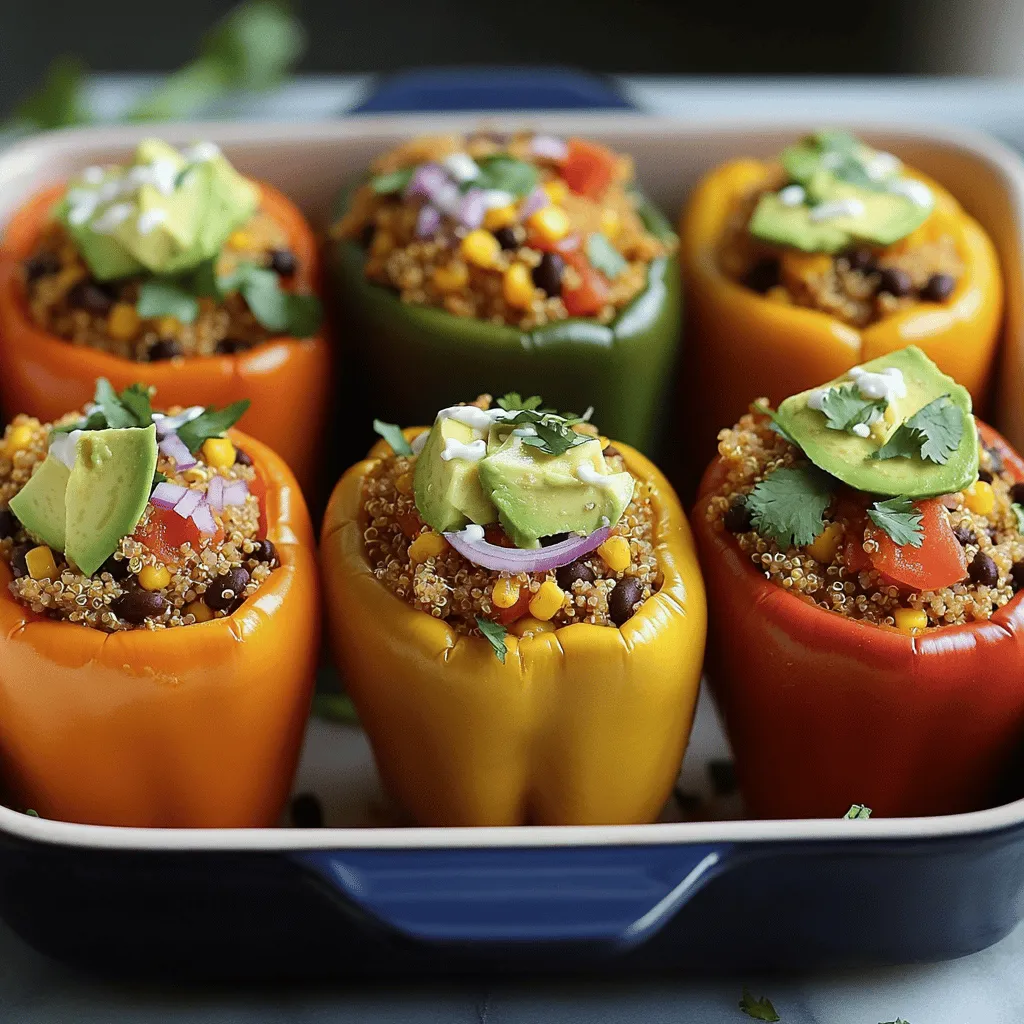Now, fold the cooked quinoa into the filling mixture. Add a quarter cup of chopped fresh cilantro and the juice of one lime. Mix this well. Then, take the filling and spoon it into each bell pepper. Pack it in firmly for a nice, hearty bite. If you like, sprinkle some vegan cheese on top. To bake, pour a little water into the bottom of the dish. Cover it tightly with foil and bake for 30 minutes. After that, remove the foil and bake for another 10 to 15 minutes. The peppers should be tender and a bit blistered. Let them cool for a few minutes before serving. Top each stuffed pepper with slices of avocado for a creamy finish.