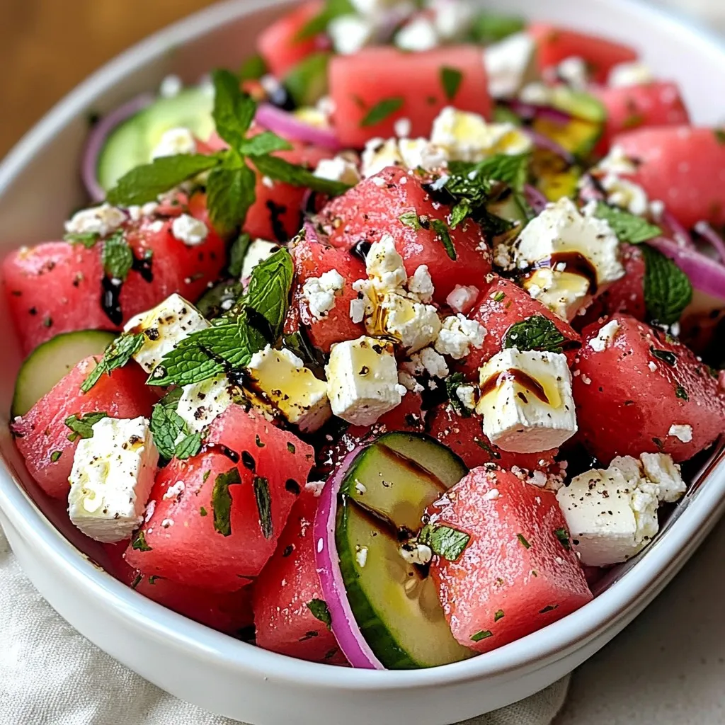 The Watermelon Feta Salad stays fresh for about 2 to 3 days in the fridge. After that, the watermelon may start to lose its texture. The cucumber and feta could also become mushy. If you notice any off smells or colors, it’s best to toss it out. Eating fresh food is key to enjoying this dish at its best.