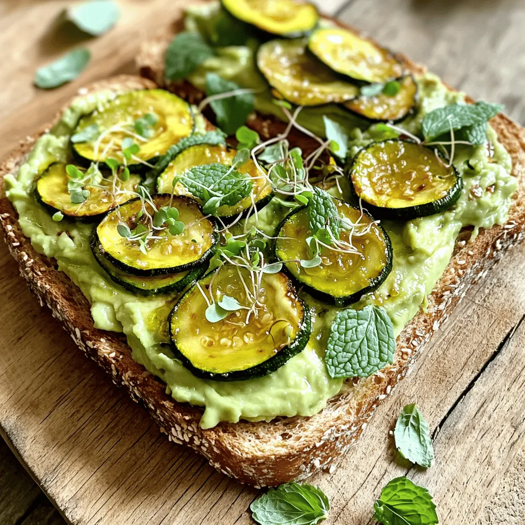 ![To make Zucchini Avocado Toast, gather these ingredients: - 2 slices of whole grain bread - 1 medium zucchini, thinly sliced - 1 ripe avocado - 1 tablespoon extra virgin olive oil - 1 clove garlic, finely minced - 1 tablespoon freshly squeezed lemon juice - 1/4 teaspoon crushed red pepper flakes - Salt and freshly ground black pepper, to taste - Fresh mint leaves, for garnish - Microgreens or arugula, for topping (optional) This recipe yields two delicious servings. It’s a simple and fun dish to prepare. When measuring ingredients, precision helps. Use a standard measuring spoon for liquids. A kitchen scale ensures accurate weight for solid items like zucchini and avocado. Slice the zucchini as thin as possible for even cooking. This way, your toast will be light and tasty. To keep your ingredients fresh, pick ripe avocados with smooth skin. Look for zucchini that feels firm and has a shiny skin. Store avocados at room temperature until ripe. Once ripe, place them in the fridge to slow down the softening. Fresh herbs, like mint, should stay in water or wrapped in a damp paper towel. This way, they stay crisp for your garnish. Start by washing the zucchini. Slice it thinly. Take a small bowl and mix the zucchini with olive oil, minced garlic, salt, and pepper. Make sure all pieces are coated well. This step adds flavor and helps with cooking. Heat a non-stick skillet on medium. Once it’s hot, add the zucchini in a single layer. Cook for about 5 to 6 minutes. Stir occasionally, so they cook evenly. They should turn tender and golden. When done, take the skillet off the heat and set the zucchini aside. Grab a bowl and cut the ripe avocado in half. Remove the pit and scoop out the flesh. Mash it with a fork until it’s creamy. Mix in the lemon juice, crushed red pepper, salt, and pepper. This will add a nice zing to your toast. While you prepare the avocado, toast the whole grain bread. You can use a toaster or a hot skillet. Toast it until it’s golden brown and crispy. This crunch will balance the soft toppings. Now it’s time to build your toast. Spread the mashed avocado on each slice of toasted bread. Layer the sautéed zucchini on top. This creates a colorful and tasty dish. Finish your toast with fresh mint leaves on top. If you like, add microgreens or arugula for extra flavor. Serve your beautiful creation right away. For a touch of elegance, drizzle olive oil over the top. A few edible flowers can also brighten up your plate. This recipe makes a delightful meal or snack. To explore more, check the full recipe for all details. To boost flavor, add spices to the zucchini. Try smoked paprika or cumin. These spices give a warm taste. For a fresh kick, mix in lime juice instead of lemon. This small change can brighten the dish. Adding herbs like basil or cilantro gives more depth. Don't forget to taste as you go! Make your toast pop with color. Use a dark plate to show off the green. Arrange the zucchini in a fan shape on top. This makes the dish look fancy. Drizzle olive oil over the top for shine. For extra flair, add edible flowers or microgreens. These small touches make a big impact! One mistake is not seasoning the avocado. Always add salt and pepper to enhance flavor. Avoid overcooking the zucchini. It should be tender, not mushy. Another common error is using stale bread. Fresh bread gives a better crunch. Lastly, don’t skip the garnish. It adds flavor and looks nice. For the complete experience, check out the Full Recipe. {{image_4}} You can make your zucchini avocado toast even better with toppings. Try adding sliced radishes for crunch or a sprinkle of feta cheese for a salty touch. Cherry tomatoes add sweetness and color. Fresh herbs like basil or dill can brighten up the dish. You can even add a poached egg on top for extra protein. These toppings can change the flavor and make the dish more exciting. The base of your toast can change the whole meal. Instead of whole grain bread, try sourdough for a tangy taste. A bagel or pita can work too! Gluten-free bread is great for those with allergies. You can even use sweet potato slices for a unique twist. Each choice offers a different texture and flavor. If you like spice, add jalapeños or a dash of hot sauce to the avocado mix. You can also swap the zucchini for roasted red peppers for a smoky flavor. For a heartier meal, mix in cooked quinoa or black beans. These options add protein and make the dish filling. Each variation makes your zucchini avocado toast truly your own. For the complete recipe, check out the [Full Recipe]. Zucchini is low in calories, which is great for weight control. It helps keep your body hydrated because it has high water content. Zucchini also has fiber, which aids in digestion. This veggie contains vitamins A and C, which support your immune system. Eating zucchini can help with heart health, too, as it may lower cholesterol. Each serving of Zucchini Avocado Toast has: - Calories: Around 300 - Protein: 9 grams - Carbohydrates: 30 grams - Fat: 18 grams - Fiber: 7 grams This dish packs a punch of nutrients! You get healthy fats from the avocado and fiber from both the zucchini and bread. Traditional avocado toast usually includes just avocado and bread. While tasty, it misses out on the added nutrients from zucchini. Zucchini adds more vitamins and fiber to your meal. It also brings a nice crunch and fresh taste. This makes our Zucchini Avocado Toast not only delicious but a more balanced choice. You can find the full recipe [here](#Full Recipe). Yes, you can use many types of bread. Whole grain, sourdough, and gluten-free bread work well. Each option gives a unique taste. Choose what you enjoy most. You can store leftovers for one day in the fridge. The bread may get soggy, so eat it fresh if possible. If you have extra toppings, keep them separate. Cooking the zucchini is not a must. You can enjoy it raw for a crunchier texture. Cooking adds warmth and softens the flavor, making it more s